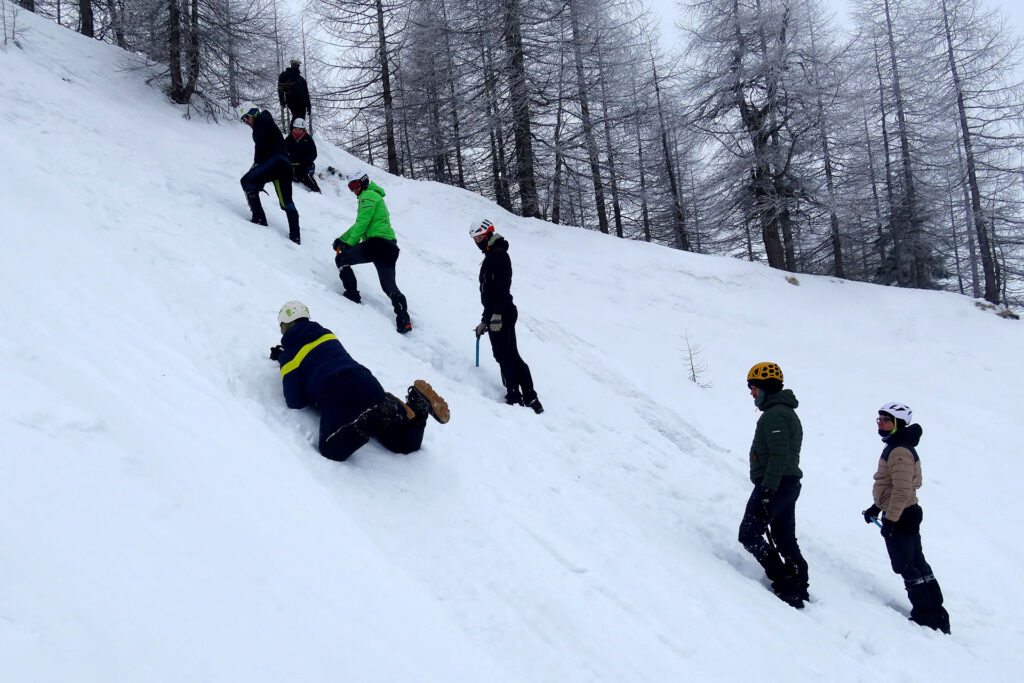 Ustavljenje s cepinom na zimskem tečaju varnega gibanja v gorah
