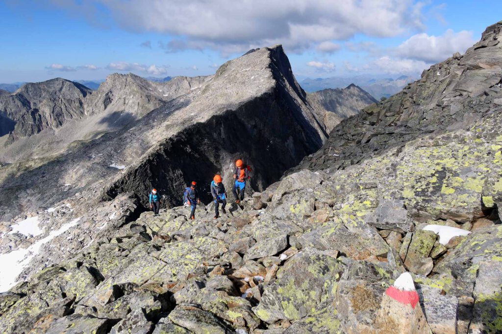 Zgodnji zajtrk potem pa se od koče podamo na pot nekdanjega ledenika Lassacherkees in naprej v smeri severa in zahodnega grebena Detmolder Grat od kjer nas vodi zavarovana pot (ocena C) do vrha kraljice Visokih Tur. Na vrhu nas čakajo širni razgledi, ki ob čistem ozračju segajo vse do našega Triglava in še dlje. Spust sledi po vzhodnem grebenu do Steinerne Mandln (3158 m), kjer se nato po zavarovani poti (C, mesto D) spustimo do ledenika Trippkees, ki počasi izginja. Sledi sestop po ledeniški moreni do poti, ki vodi do koče Giessener Hütte (2215 m), od tam pa po označeni poti do parkirišča.